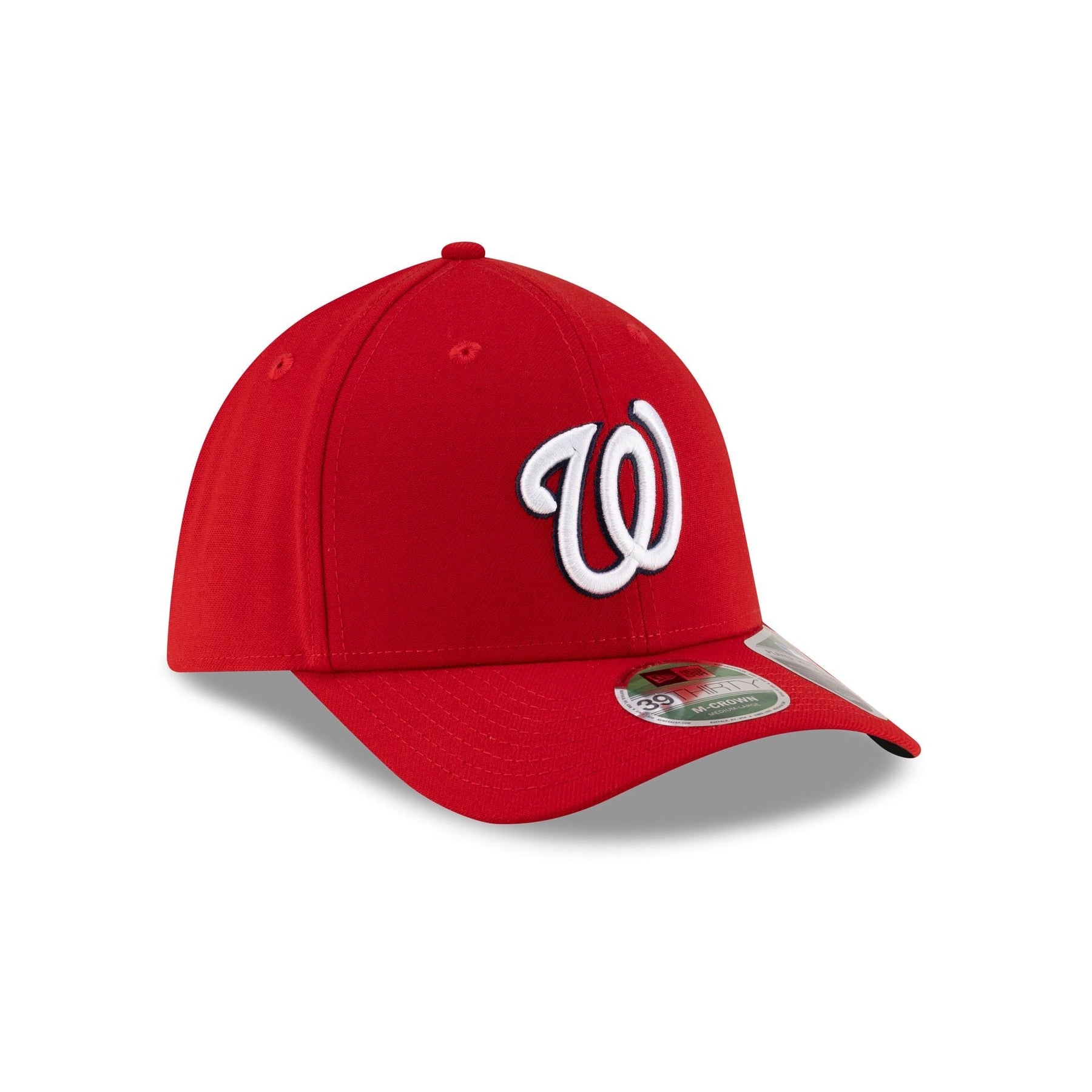 The Washington Nationals Player Replica 39THIRTY M-Crown Stretch Fit Cap features an embroidered Nationals logo at the front panels with a matching MLB Batterman logo at the rear and a black undervisor. Additional details include a Performance Stretch sweatband and a New Era Flag at the left-wear side.